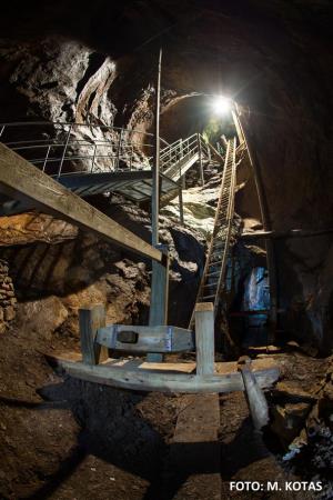 Rekonstruované důlní dílo z 16. století. V různých úrovních jsou dobře zachovalé části ručně sekaných chodeb a komínů z nejstarších období