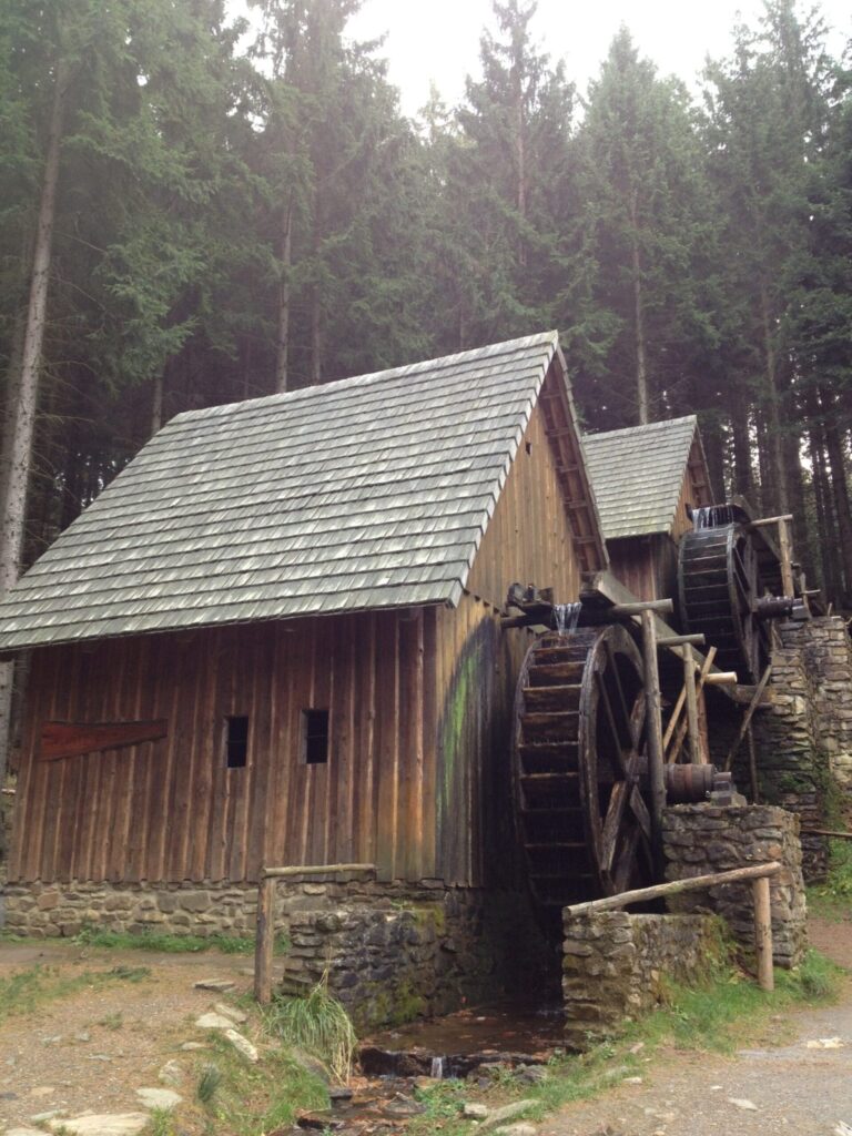 Replika vodou poháněných středověkých hornických mlýnů, tavící pec a hornická osada s občerstvením a dětským hřištěm, vše asi 10-ti minutovou procházkou kolem říčky Olešnice.